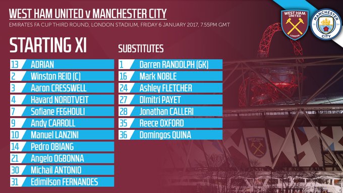 Dimitri Payet starts on the bench for the Hammers, as does captain Mark Noble who clearly hasn't recovered from that knock sustained at Leicester. Bilic's side will fancy their chances against City's centre back pairing of